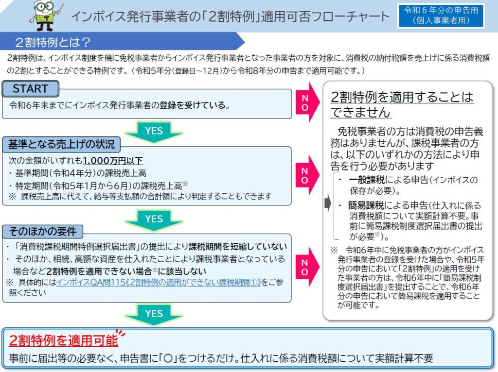 2割特例が適用できるかどうかについて、国税庁HPにわかりやすくまとめられていますのでこちらもご参照ください。